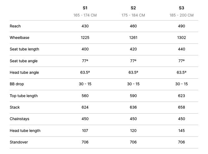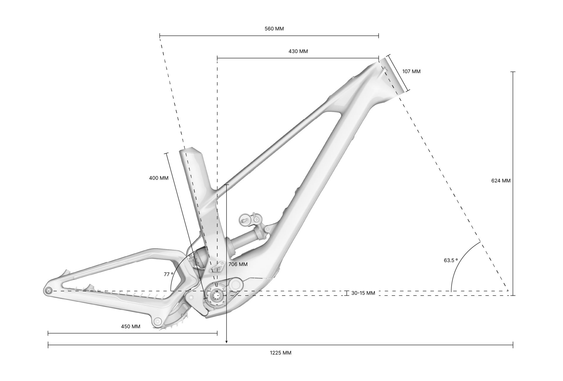 Agresivní geometrie - úhel vidlice k rámu je 63,5°.