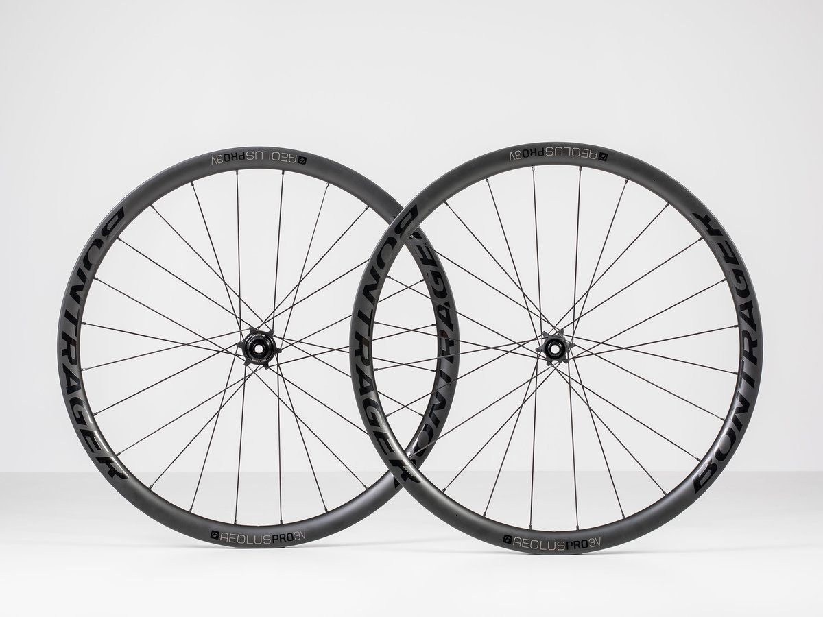 Pevná, lehká a odolná karbonová kola Bontrager Aeolus PRO V3 s 25mm vnitřní šířkou ráfku a náboji Bontrager Rapid Drive 108, které jsou ideální pro široké silniční nebo gravel pláště.